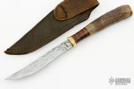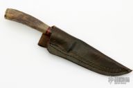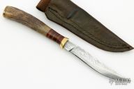 This Bird and Trout by Wendell Fox features a Cable Damascus blade with .142" blade stock and .617" blade depth, hidden tang construction. The handle has a brass guard and textured butt with a stag and stacked leather grip. Comes with a brown leather sheath. Excellent condition.