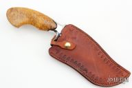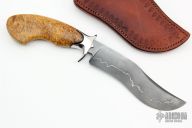 This Bowie by Josh Botelho features a San Mai Damascus blade with a false top edge, .227" blade stock and 1.442" blade depth, hidden tang construction. The handle has a stainless steel guard, Acacia Burl wood grip with copper tang nut in the butt, it is flush with the handle. Comes with a hand tooled brown leather sheath. New from maker.