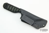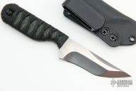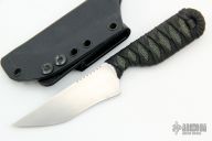 This knife by Joe Watson features fun metal finished chisel ground blade with notched thumbrest, .162" blade stock, 1.129" blade depth, hidden tang construction. The handle features a black cord wrap over green stingray skin. Comes with a kydex sheath. Excellent Condition.