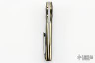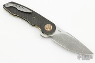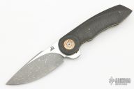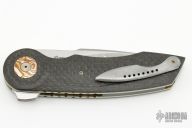 This Gold Standard Flipper by JD Van Deventer features a Chad Nichols Damascus blade with swedge and checkered flipper. The handle has lightning strike carbon fiber scales with mokume pivot collars, Damascus tip up clip, anodized and fileworked titanium liners, black G-10 backspacer with lanyard pin. Rides on Dual Row IKBS. Comes with velcro case and COA. Excellent condition.