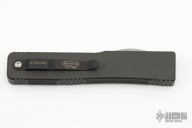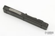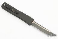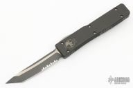 This Ultratech OTF automatic from Microtech features a two-tone partially serrated blade. The handle has a black anodized aluminum handle with stainless steel thumb slide and tip down clip. Dated 02/2003 with a serial number of 0910. Includes original box, sheath and papers. Excellent condition.