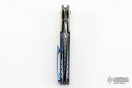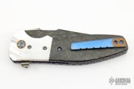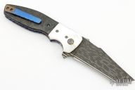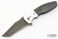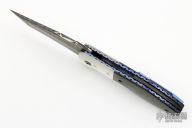 This Augustus Flipper by Kirby Lambert features a Chad Nichols Damascus blade with notched thumbrest and flipper. The handle has mother of pearl bolsters, marble carbon fiber scales, fileworked and anodized titanium liners, floating marble carbon fiber backspacer, and a tip up fileworked and anodized titanium clip, anodized titanium hardware and anodized titanium pivot collars. Nice detent, lockup and blade seating, rides on bearings. Comes with velcro case. Excellent condition.