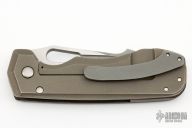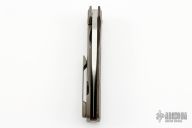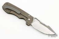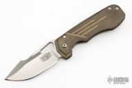 This Blood and Thunder V1 by Jason Stout features a tumble finished blade with fullers and a thumbhole. The handle has a milled green canvas micarta and titanium frame with a matching tip up pocket clip, green canvas micarta backspacer. Nice detent, lockup and blade seating. Has a couple light scuffs, otherwise excellent condition.  Comes with a zippered case.