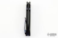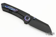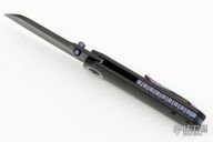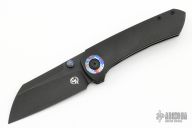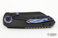 This Maverick S by Matthew Christensen features a black tumbled blade with dual DarkTi thumbstuds. The handle has a black tumbled titanium frame, inlaid stainless lockface insert, DarkTi pivot collars, backspacer and tip up clip. Comes with original cloth case and box. Excellent condition.