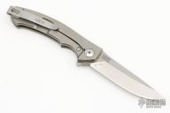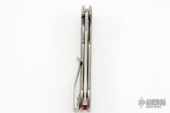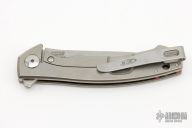 This 0450 Sinkevich designed folder from Zero Tolerance features a drop point blade with swedge and flipper. The handle is comprised of a tumbled titanium frame over red anodized aluminum stand offs, has deep carry titanium pocket clip. Comes with original ZT papers. Has a couple light scuffs and scratches, otherwise excellent condition.