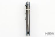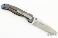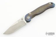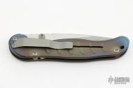 This Apogee by Darrel Ralph features a two-tone recurve blade that is marked #14. The handle has an anodized titanium frame with a tip down bead blasted SS clip. Excellent condition. Nice detent, lockup and blade seating. Comes with a zippered case.