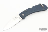 "The Boye Pointed Tip has a curved and pointed utility blade shape. It is as light and flat and useful as we can make it. It's easy to carry and deploy with either hand. This is a basic, all-around knife design that will come through time after time for all sorts of jobs, including the kitchen. But all of this versatility makes this blade a little too dangerous to use in freeing moving lines and people in rough water, in which case the Sheepsfoot blade is recommended. If means permit, consider carrying both - the Sheepsfoot as your primary safety knife, and the Pointed Tip as your workaday companion knife." Has some light scratches, otherwise excellent condition.