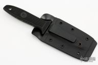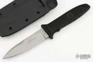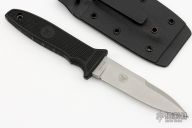 This M-10 by Gryphon Knives is a Bob Terzuola design, it has a bead blasted spear point blade with false top edge and notched thumbrest, .196" blade stock and .919" blade depth, hidden tang construction. The handle has a black FRN grip with lanyard hole. Comes with kydex sheath with small TekLok. Has some light scuffs and scratches, otherwise excellent condition.