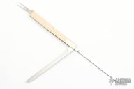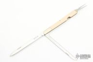 This custom 3 blade slipjoint features a drop point blade, a fully serrated blade and a two-prong fork.  The handle features nickel silver bolsters and liners with paper micarta covers.  Light scratches are visible, but the knife is in excellent condition.