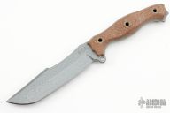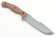 This P&L Statement by Busse features a silver textured finished clip point blade with .223" blade stock and 1.409" blade depth, full tang construction. The handle has tan canvas micarta scales with a lanyard hole at the butt. New from Maker!