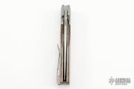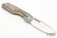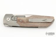 This Synapse XL Second Run Folder by Vero Engineering features a satin finish blade with notched thumbrest and flipper. The handle has a tumbled titanium frame with natural canvas micarta scales, tip up titanium clip with hidden screws. Rides on bearings, nice detent, lockup and blade seating. Comes with zippered case and patch. Excellent condition.
