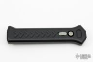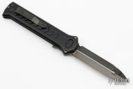 The blade is black and is double edged. The handle is milled aluminum with a black stainless steel pocket clip, tip down carry. The push button fires the blade and when open, allows you to retract the blade. Sliding safety. Excellent condition. Comes with a zippered case.