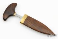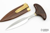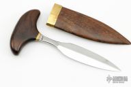 This Push Dagger by Ralph Bone has a double edged and satin finished blade, .179" blade stock and .831" blade depth, hidden tang construction. The handle has a brass guard and a wooden grip. Comes with a wooden boot scabbard with brass collar and clip. "P105" on the tang. Has a couple very light scratches, otherwise excellent condition.