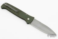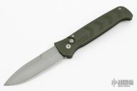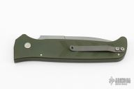 This Militia Auto by Rob Dalton features a bead blast finished blade and a green anodized aluminum frame with safety. Titanium clip, tip up carry. Powerful coil spring action. Has a few light scuffs, otherwise excellent condition.