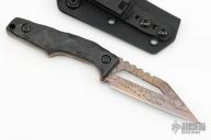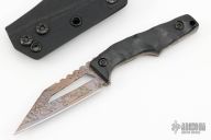 This Stark V2 by Bawidamann Blades features an acid etch with patina finish on the blade, has notched thumbrest, .104" blade stock and 1.015" blade depth, full tang construction. The handle has IM Bawidamann Chunked Pattern Carbon Fiber scales (proprietary Carbon fiber composite). Comes ready to carry with the Bawidamann Uberscabbard. New from maker.