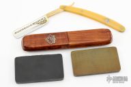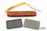 This Straight Razor by Puma features a 24k gold plated, full hollow ground, satin finished blade with a gold handle. Comes with original wood box and vintage sharpening stones. Small crack in the pin. Excellent condition otherwise.