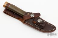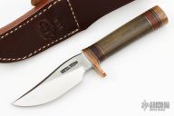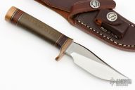 The miniature Model 27 debuted in Randall's 2012 75th anniversary catalog and is the first catalog miniature model. This knife has a 3.5" stainless steel blade, .172" blade stock and 1.024" blade depth, hidden tang construction. The handle has a copper guard and butt, green micarta grip, and black/copper/leather spacer pattern. Comes with a brown leather sheath. Has a scratch in the micarta, and a few light scratches on the blade, otherwise good condition.