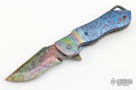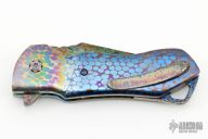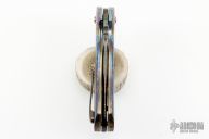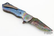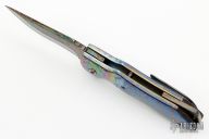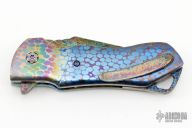 This Spectre flipper by David Kulis features a Bertie Rietveld Dragonskin Damascus blade with notched thumbrest and flipper. The handle has Vegas Forge Dragonskin DamTanium scales with faux bolster, Bertie Rietveld Dragonskin Damascus floating backspacer and tip up clip with hidden screws, anodized titanium liners with jeweled interiors. Rides on bearings, nice detent, lockup and blade seating. Anodized titanium screws. Comes with a zippered case and COA #22. Has a couple of light scratches, otherwise excellent condition.