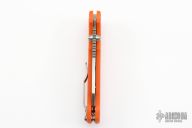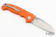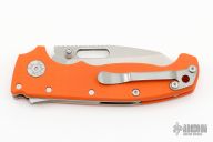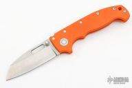 This AD20S by Andrew Demko features a stonewashed shark foot blade with notched thumbrest and dual thumbstuds.   The handle has a orange G-10 frame with a tip up stainless steel clip and "Shark" lock release on the spine. Excellent condition.