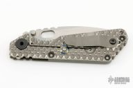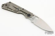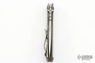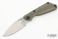 This SNG DGG by Strider has a stonewash spear point blade with dual thumbstuds, thumbhole, and a notched thumbrest. Handle is green G-10 and bead blasted titanium "Gunner Grip", lockbar stabilizer, and titanium tip up clip. Nice detent, lockup and blade seating. Has a few light scuffs, otherwise excellent condition.