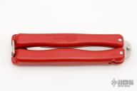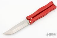This Vintage CIA Balisong by Hackman has a satin finished stainless steel clip point blade. Handle is red polymer with O-latch at butt. Has a couple spots on the blade, otherwise excellent condition. Comes with a zippered case.