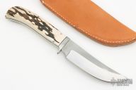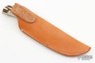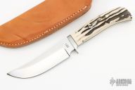 This Hunter by Tommy Lee features a mirror polished blade with .161" blade stock and 1.238" blade depth, full tapered tang construction. The handle has a stainless steel guard, stag scales with black liners and stainless steel pins. Comes with a brown leather sheath. Has some scratches and a light stain on the blade, otherwise good condition.