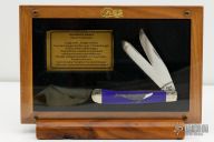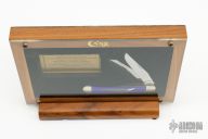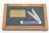 This 2-Blade Trapper by Case has mirror polished blades, nickel silver bolsters, blue lapis covers with humpback whale inlay, brass liners and stainless springs. Comes with original display case and papers. Excellent condition. #289 of 500