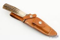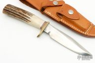 This Model 5-5 by Randall Made Knives features a satin finished blade with false top edge and notched thumbrest, .212" blade stock and 1.084" blade depth, hidden tang construction. The handle has a brass guard, stag grip red/white/blue spacers. Comes with a brown leather sheath. Has a few light scratches, otherwise excellent condition.