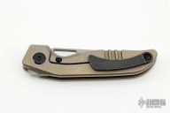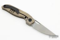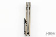 This Micro Transient flipper by Hellion Machine Collective features a tumble finished blade notched thumbrest and flipper. The handle has an anodized and stonewashed titanium frame with matching tip up clip. Rides on bearings, nice detent, lockup and blade seating. Comes with original box. Excellent condition.