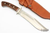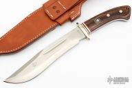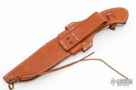 This Grizzly Bowie by Tak Blades features a satin finished, recurved bowie style blade with swedge and fullers, .243" blade stock and 1.751" blade depth, hidden/frame tang construction. The handle has a nickel silver guard with nickel silver and red and black fiber spacers, dymondwood scales with Grizzly Paw shield and nickel silver pins over full tang construction. Brass lanyard tube in pommel. Includes leather sheath with belt loop. Excellent Condition.