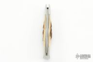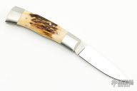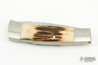 This Lockback by HF Rollings features a mirror polished blade with nail nick. The handle has stainless steel bolsters and stag covers, stainless steel liners and backspacer. has some scratches, otherwise good condition.