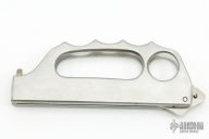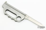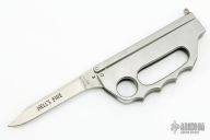 This Hell's Fire Balisong by Valor has a satin finished blade. The handle features a stainless steel handles with knuckles attached. Has some light scratches and patina, otherwise good condition.