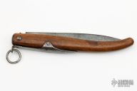 This French folding Couvreux ringlock knife has a dark hardwood handle with steel ringlock mechanism on the spine. The blade is carbon steel and has some pitting and patina. These knives were used by the French throughout the war, and later bought by American expeditionary troops upon their arrival.