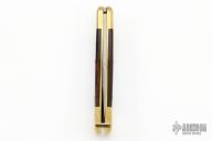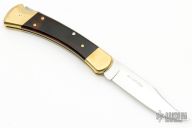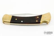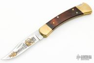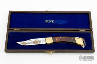 This Model 110 by Buck features a laser engraved blade with nail nick. The handle has a brass frame with wood scales. Comes with original box. #0230 of 2000 on blade. Excellent Condition.