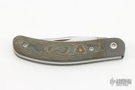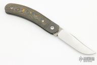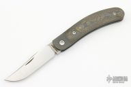 This Javelina Jack is a Sowbelly slipjoint model by Jack Wolf Knives featuring a satin finished clip point blade with nailnick. The handle has integral bead blast finish fluted titanium front bolsters and liners, camocarbon scales with a stainless spring. Comes with box, metallic tube with Sean Tiffany artwork, leather slip, sticker and microfiber cleaning cloth. New condition.