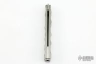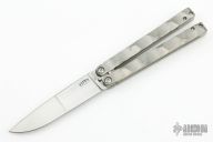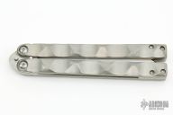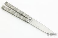 This Balisong by Jason Tippy features a hand rub satin finished blade. One side has a full flat grind and the other has a compound grind. The handles are rock pattern titanium, titanium spacers, 416 stainless steel pivots, phosporous bronze washers. Latchless. New from maker.