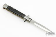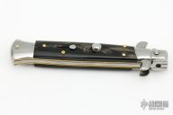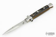This 9" Picklock by Frank Beltrame features a polished bayonet ground 4mm blade with false top edge. The handle has stainless steel bolsters, front and rear, buffalo horn scales, brass liners, stainless spring. Excellent condition.