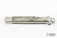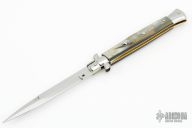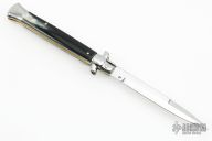This 11" Picklock by Frank Beltrame features a mirror polished bayonet ground 4mm blade with false top edge. The handle has mirror polished stainless steel bolsters, front and rear, buffalo horn scales, mirror polished brass liners and stainless steel spring. Excellent condition. This knife was professionally tuned and polished by Greg's Effects.