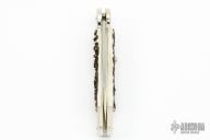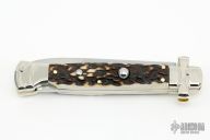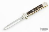 This lockback Auto by AGA Campolin has a mirror polished stainless steel spear point blade with false top edge. Handle is stag with mirror polished nickel silver bolsters, brass liners,stainless steel back spacer. Excellent condition. Comes with original box, leather slip sheath and COA.