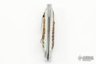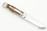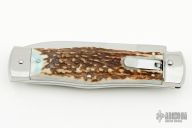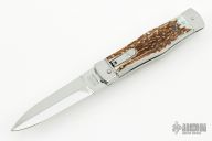 This lever auto from Mikov Knives has a mirror polished spear point blade with false top edge. The handle has polished stainless steel bolsters and liners, and stag scales, tip down stainless steel clip. Action is smooth and strong. Comes with original box, papers and black leather sheath. Excellent condition. This knife was professionally tuned and polished by Greg's Effects.