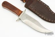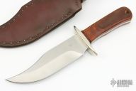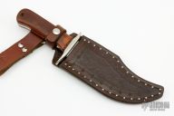 This custom bowie by Buck Custom Shop features a satin finished blade with .176" blade stock and 1.987" blade depth, full tang construction. The handle has a nickel silver guard, brown canvas micarta scales with red liners, lanyard hole. Comes with a hand tooled brown leather sheath. Has a few light scratches, excellent condition.