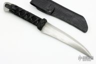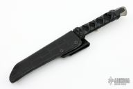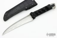 This knife by ITAC features a Hawkbill blade with nice hamon, .243" blade stock and 1.389" blade depth, full tang construction with leather wrapped handle over stingray skin and a Turks head paracord guard. Comes with a leather covered kydex sheath. Excellent condition.