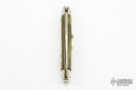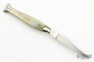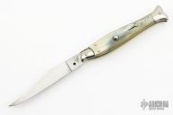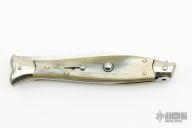 This Fish side opening automatic by AKC Italy features a satin finished clip point blade. The handle has nickel silver bolsters, front and rear, honey horn scales, brass liners, and a stainless steel backspacer. Has safety. The action and safety are loose.  Has a few small divots in the horn, otherwise excellent condition.