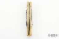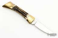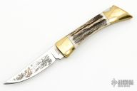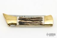 The Franklin Mint Wildlife Series was manufactured by Boker. This one has an upswept stonewashed blade with an image of a flyfisherman catching a fix. The handle has a brass frame with dovetailed bolsters, stag scales, stainless steel backspacer. Excellent condition.