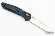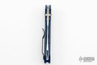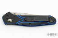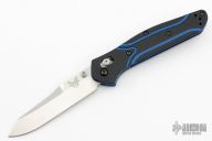 This 940-1501 Osborne Axis Lock Folder from Benchmade has a satin finished CPM-20CV clip point blade with false top edge and dual thumbstuds. Handle has milled blue/black G-10 scales, blue standoffs and black finished stainless steel tip up, deep carry clip. (RH/LH Reversible). Knife has centered blade seating and strong lockup. Comes with original box, soft pouch, and papers. Excellent Condition.