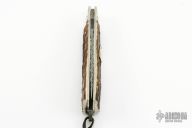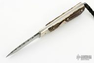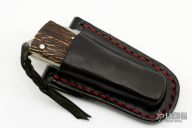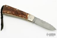 This slipjoint by JD Ware features a satin finished blade with fileworked spine and notched thumbrest, has nail nick. The handle has fluted nickel silver bolsters, stag covers with a nickel silver escutcheon, nickel silver liners, steel spring with lanyard hole. Comes with a leather belt sheath. Excellent condition.