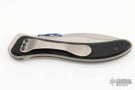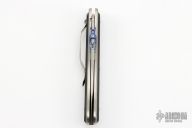 This linerlock by Jim Weatherly features a satin finished blade with anodized titanium thumbdisc. The handle has black G-10 scales, satin titanium frame and liner, tip down titanium clip. Nice detent, lockup and blade seating. Excellent condition.