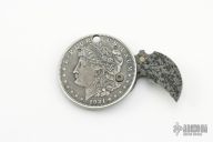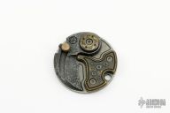 This Custom Coin Claw Gen 4 by Serge Panchenko features a patina chisel ground wharncliffe blade with a brass thumbstud and embellished pivot collar. The handle is stonewashed titanium with a brass overlay. Has a detent to hold the blade in position open/closed, but it does not lock. Made from a 1921 Morgan silver dollar. Comes with original tin and makers card. Excellent condition.