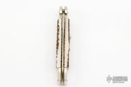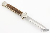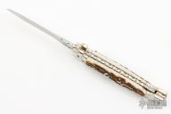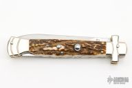 This lockback Auto by AGA Campolin has a mirror polished stainless steel spear point blade with fileworked spine and false top edge. Handle is stag with mirror polished nickel silver bolsters, fileworked brass liners, fileworked stainless steel backspacer. Has some light scratches, otherwise excellent condition. Comes with original box.