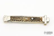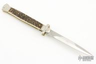 This lockback Auto by AGA Campolin has a mirror polished stainless steel spear point blade with false top edge. Handle is stag with mirror polished nickel silver bolsters, brass liners, stainless steel back spacer. Comes with a leather slip sheath and COA. Excellent condition.